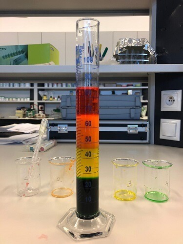 Deney sonucunda içine en fazla şeker karıştırılan, yani özkütlesi en yüksek olan renkteki sıvı en altta kalacak. Diğer renklerdeki sıvılar ise özkütlesi yüksek olandan düşük olana doğru alttan üste doğru sıralanacak.