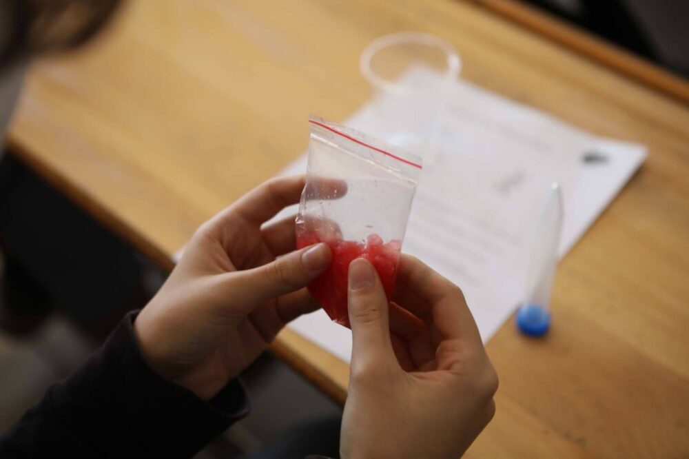 Bu deney, canlıların tüm kalıtsal bilgilerini bulunduran eşsiz bir molekül olan DNA’yı gözle görülebilir hale getirmeyi amaçlıyor. Bitkilerin yediğimiz meyveleri dâhil tüm canlılarda DNA bulunmaktadır. Bu deney için bir parça meyve veya sebze (yumuşak dokulu örn. domates, kivi, çilek vb. önerilir), sıvı bulaşık deterjanı, sofra tuzu, küçük boş kavanoz, 80 derece kolonya, kilitli saklama torbası, çay süzgeci, su, tatlı kaşığı, su bardağı ve karıştırma çubuğuna ihtiyacımız var. Kesilen meyve parçasını kilitli saklama torbasının içine koyun, ağzını kapatın ve torbanın içindeki meyveyi iyice ezin. Kavanozun içine bir tatlı kaşığı sıvı bulaşık deterjanı, bir tatlı kaşığı kadar tuz ve üstünü tamamlayacak kadar su koyun, karıştırın. Hazırladığınız çözeltiyi (karışımı), kilitli saklama torbasındaki ezilmiş meyve üzerine ekleyin, torbanın ağzını kapatın ve içindekiler karışana kadar ezmeye devam edin. Bir adet su bardağının üzerine çay süzgecini yerleştirin. Torba içinde ezerek hazırladığınız meyve karışımından yavaşça ve taşmayacak kadar süzgecin üzerine ekleyin. Süzülen sıvının yarısını alıp kavanozun içine aktarın ve üzerine bir çay kaşığı kolonya ekleyin.