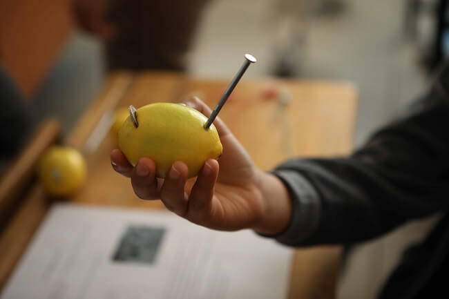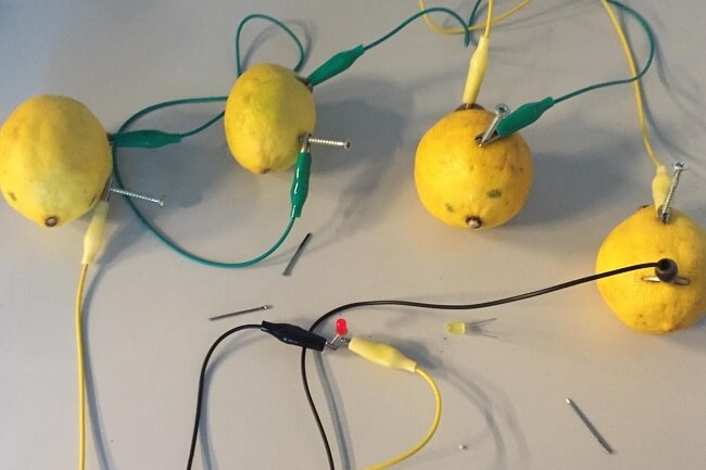 Bu deneyde kimyasal enerjiyi elektrik enerjisine dönüştürerek limondan bir pil elde edebilirsiniz. Deney için dört adet timsah klips, küçük LED ışığı, üç adet limon, üç tane bozuk para, üç galvanizli çivi ve bıçağa ihtiyacınız var. Limona yerleştirdiğiniz bakır olan bozuk para ve çinko olan çiviyi bir pilin artı ve eksi kutupları olarak düşünebilirsiniz.