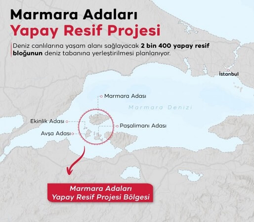 Marmara Adaları’nda sucul ekosisteme can verecek olan Marmara Adaları Yapay Resif Projesi, kaynakların üretimini artırmayı ve desteklemeyi hedefliyor. 2 bin 400 yapay resif bloğunun deniz tabanına yerleştirileceği Marmara Adaları Yapay Resif Projesi; sucul canlılarının barınmasına, beslenmesine ve üremesine imkân tanıyacak yeni yaşam alanları oluşturacak. Bölgedeki hassas ekosistemlerin korunmasına ve balıkçılık faaliyetlerine katkıda bulunacak.