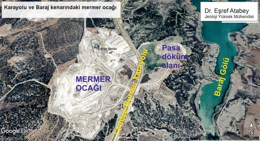 Diğer mermer ocaklarının bulunduğu bölüm Bozçay güneyindeki alanda Karaçal Barajı havzasındadır. Bozçay Havzası’ndaki barajlar ile göletler ve seddelenmiş olan Karagöl’de tutulan su, ovadaki parçalanmış kireçtaşı akiferinde toplanan suyun kuyular vasıtasıyla çekilmesi sonucunda Burdur Gölü’ne ulaşan su miktarı iyice azalmaktadır.