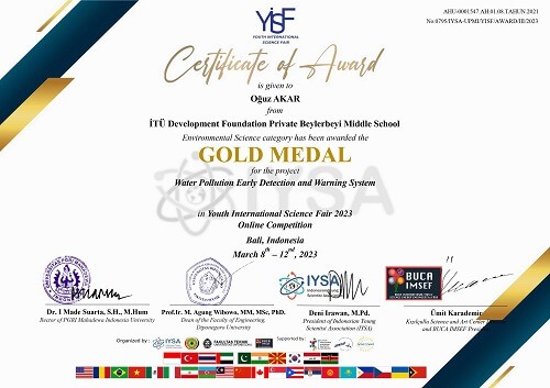 Öğrenci Akar projesiyle Indonesian Young Scientist Association (IYSA), PGRI Mahadewa Üniversitesi Bali, Mühendislik Fakültesi Diponegoro Üniversitesi ve BUCA IMSEF iş birliğiyle gerçekleştirilen Uluslararası Gençlik Bilim Fuarı Yarışması’na (Youth International Science Fair) katılarak çevrimiçi sunumunu ve savunmasını gerçekleştirdi. Öğrencinin projesi Amerika Birleşik Devletleri, Kanada, İtalya, Güney Kore, Vietnam, İran, Malezya, Singapur, Birleşik Arap Emirlikleri, Porto Riko, Tayland, Filipinler, Kırgızistan, Endonezya, Azerbaycan, Brezilya, Meksika’dan katılan öğrencilerin projeleri arasından sıyrılarak ortaokul düzeyinde altın madalyaya layık görüldü.